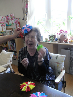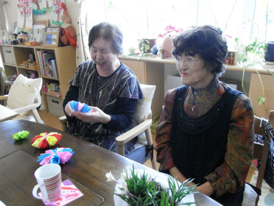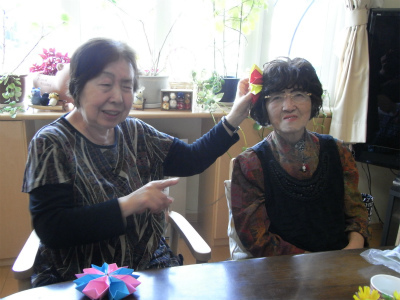 先日みんなで作った折り紙のお花に挑戦されるお客様も。
