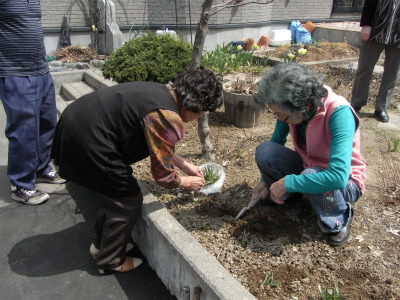早速みんなでラウンジのお庭に植えることに♪