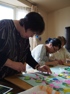 今日はみんなでラウンジのエントランスに飾る壁画作りに挑戦しましたよ。