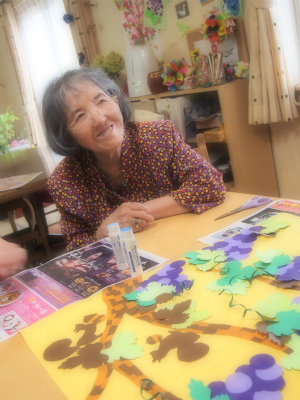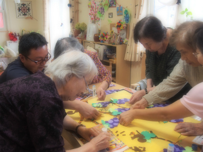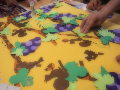 みんなで相談しながら、ぶどうやりすを貼っていきます。
