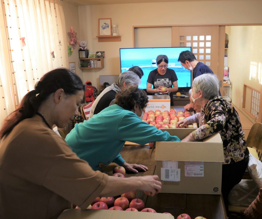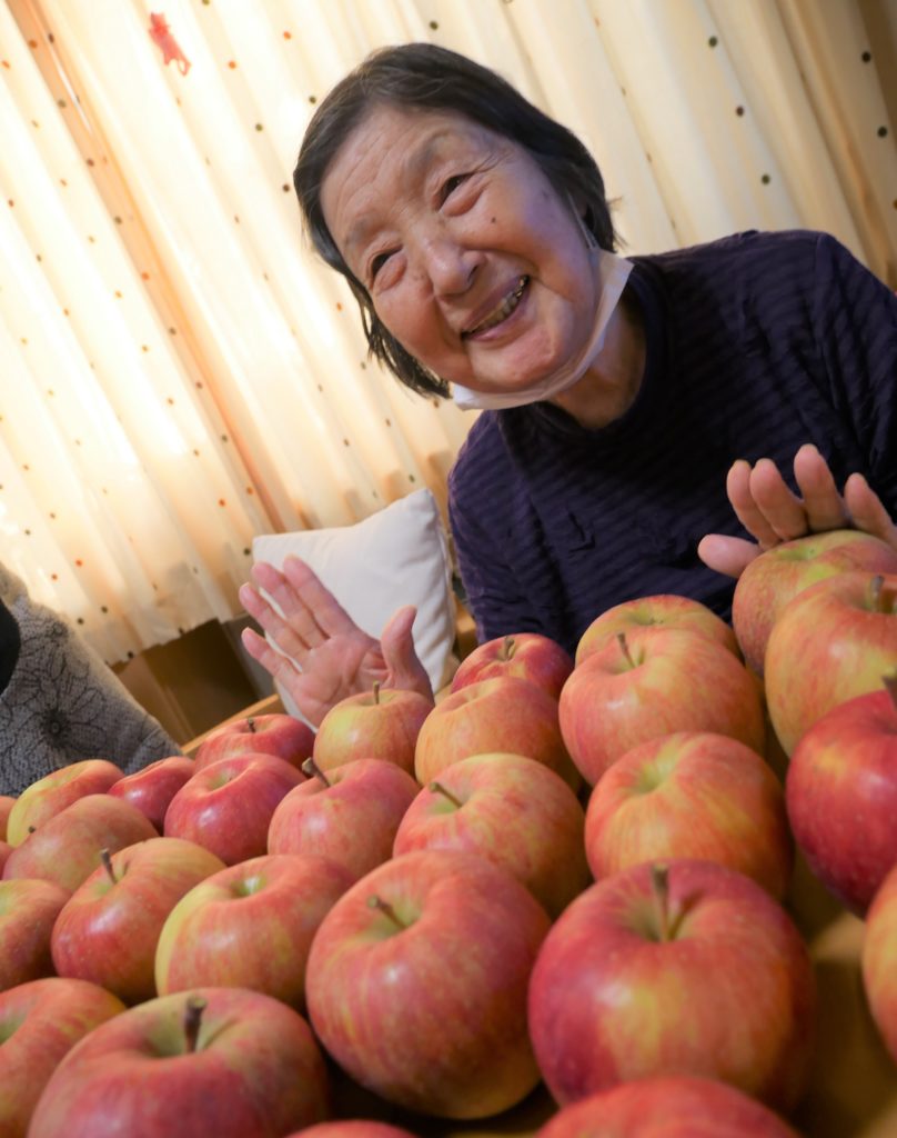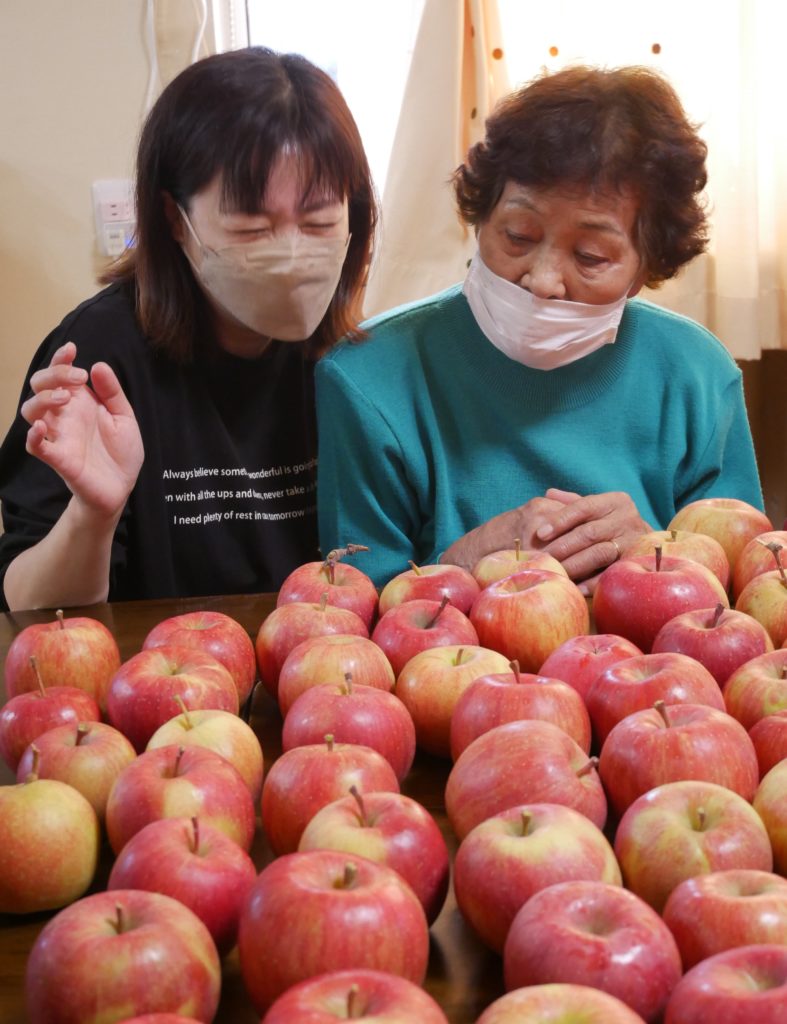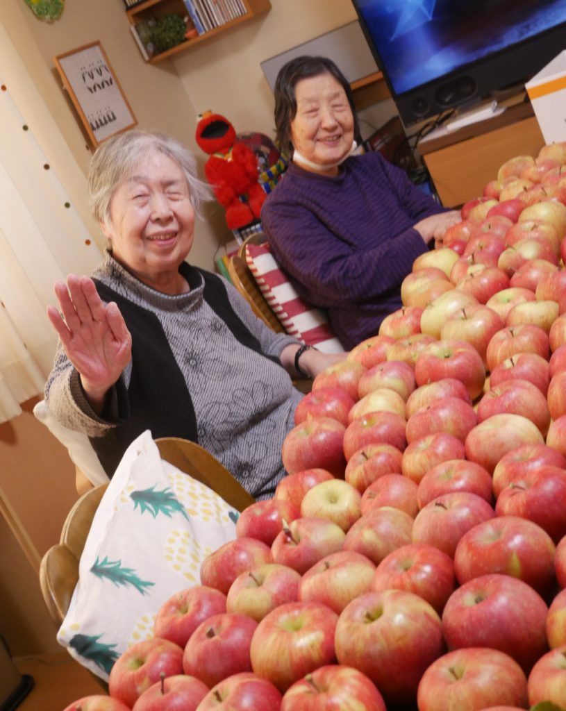 ラウンジに戻ったみなさん、収穫したりんごを並べてみましょう♪