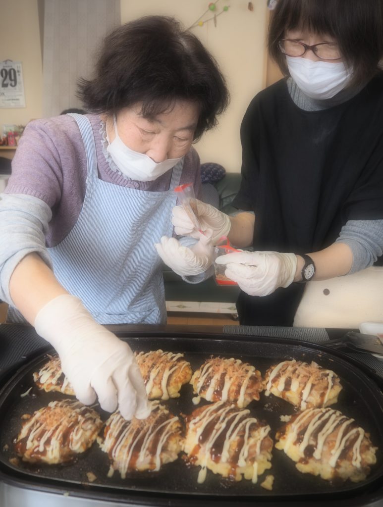 自家製マヨネーズやソース・鰹節などをトッピングして・・・